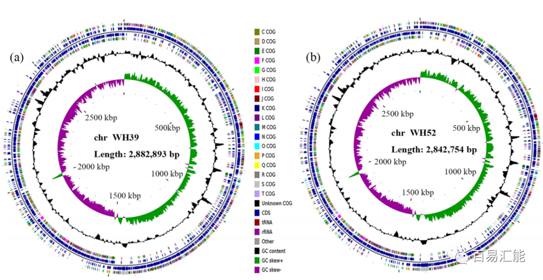 图1 菌株WH39(a)和WH52(b)染色体图谱