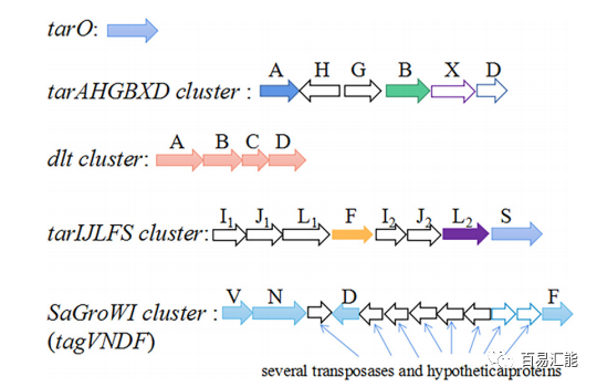 与大多数表达RboP-WTA的金黄色葡萄球菌菌株相似,16株ST630菌株均含有tarO基因和tarAHGBXD基因簇,用于WTA的生物合成和WTA转运。RboP-a-GlcNAc糖基转移酶基因tarM在所有16株ST630菌株中均存在。BJ12和WH52也包含tarIJLFS簇,用于RboPWTA聚合和b-GlcNAc糖基化。值得注意的是,WH39、WH60、WH99、WH114、WH119、WH211、WH299、HN288、NX98、BJ95、RJ1267、110900和128254包含一个SaGroWI基因簇,取代了tarIJLFS基因簇。SaGroWI基因簇已被确定为负责GroPWTA的生物合成和a-GalNAc糖基化(tagN),而NXNE同时包含SaGroWI基因簇和tarIJLFS基因簇(图3)。且在多个CoNS中鉴定了这些基因的同源物。这表明ST630与CoNS之间存在进化联系。