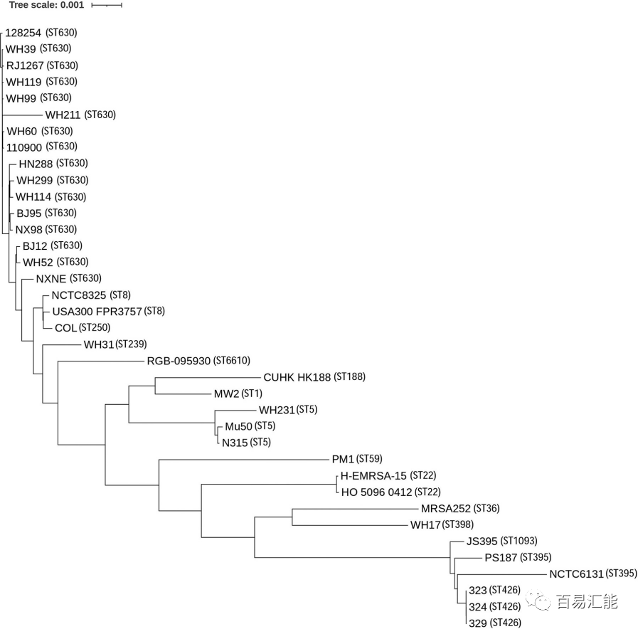 作者共纳入37条金黄色葡萄球菌基因组序列进行系统发育分析。通过蛋白预测和同源性分析,在37个分离株中均鉴定出1711个同源基因。从1711个同源基因构建的系统发育树得出,ST395、ST1093和ST426与其他ST谱系的分支更大(图3)。此外,相较于ST395菌株,ST630与其他金黄色葡萄球菌谱系之间的遗传亲缘关系更接近。ST630分离株的PFGE共检测到11种PFGE类型,相似系数为82.7%~100.0%。不同的ST630分离株的DNA片段模式相似性超过80%,说明它们之间存在密切的亲缘关系。