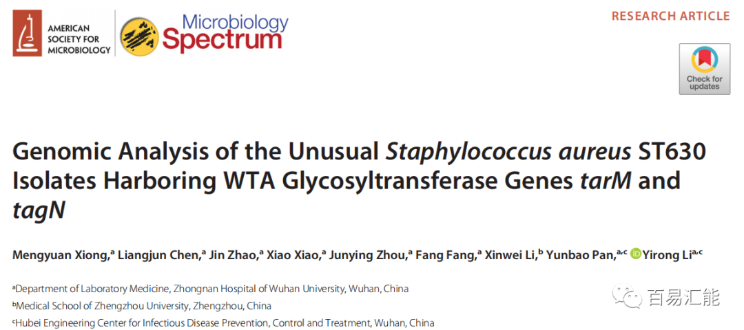 2022年2月16日,武汉大学中南医院李一荣主任团队在Microbiol Spectrum上发表了“Genomic Analysis of the Unusual Staphylococcus aureus ST630 Isolates Harboring WTA Glycosyltransferase Genes tarM and tagN”的研究论文,该研究利用全基因组测序研究了含有RboP WTA糖基转移酶基因tarM和GroP WTA糖基转移酶基因tagN的金黄色葡萄球菌ST630菌株。通过分析ST630的分子特征,发现ST630与CoNS(凝固酶阴性葡萄球菌)之间的进化联系,并通过比较基因组分析,发现ST630菌株容易从CoNS中获得DNA,并可能作为CoNS和金黄色葡萄球菌之间MGEs交换的一个新的枢纽,从而为各种MGEs(可移动遗传元件)的种间水平基因转移(HGT)创造了一条可能的新途径。百易汇能生物承担了本研究中的基因组测序及分析工作。