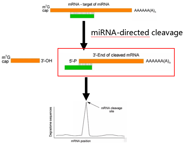 在植物中,通常miRNA与靶标序列结合紧密,在结合位点的第10/11位碱基处直接剪切mRNA从而调控下游的mRNA表达。被剪切后的mRNA变为两段,其中之一是含有3‘-polyA尾巴且5’不含cap的片段。在测序过程中,针对这种断片特异捕获,就是降解组测序。降解组测序的原理:miRNA剪切靶基因产生二个片段,5’剪切片段和3’ 剪切片段。其中3’剪切片段,包含有自由的5’ 单磷酸和3’ polyA尾巴,可被RNA连接酶,连接产物可用于下游高通量测序;而含有帽子结构的5’ 剪切片段或是其他缺少5’单磷酸基团的RNA是无法被RNA酶连接,因而无法进入下游的测序实验;对测序数据进行深入地比对分析,可以直观地发现在mRNA序列的某个位点会出现一个波峰,而该处正是候选的miRNA剪切位点。